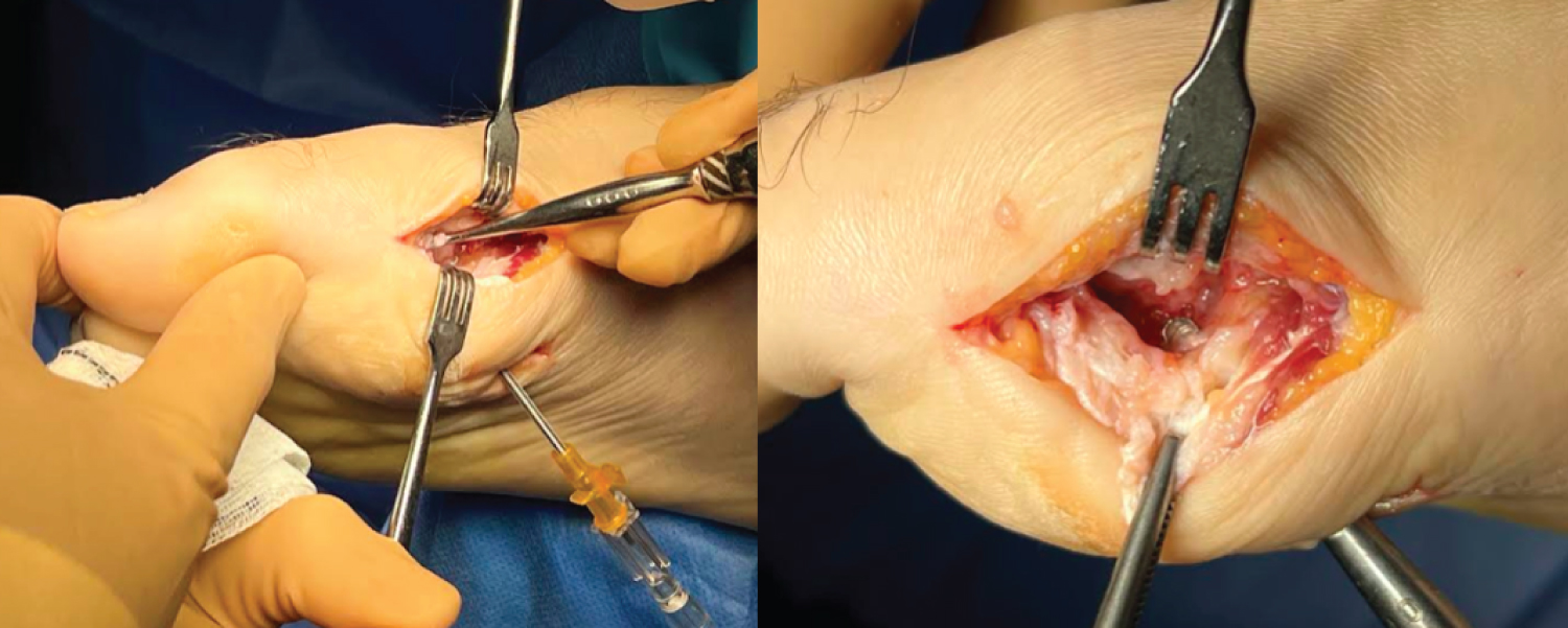 Due to the sesamoid infection, surgical intervention was performed, involving a plantar approach following the fistulous tract and a medial approach. Curettage, sample collection, and Friedrich's procedure at the edges were performed until achieving a bleeding and vitalized bed (Figure 3).