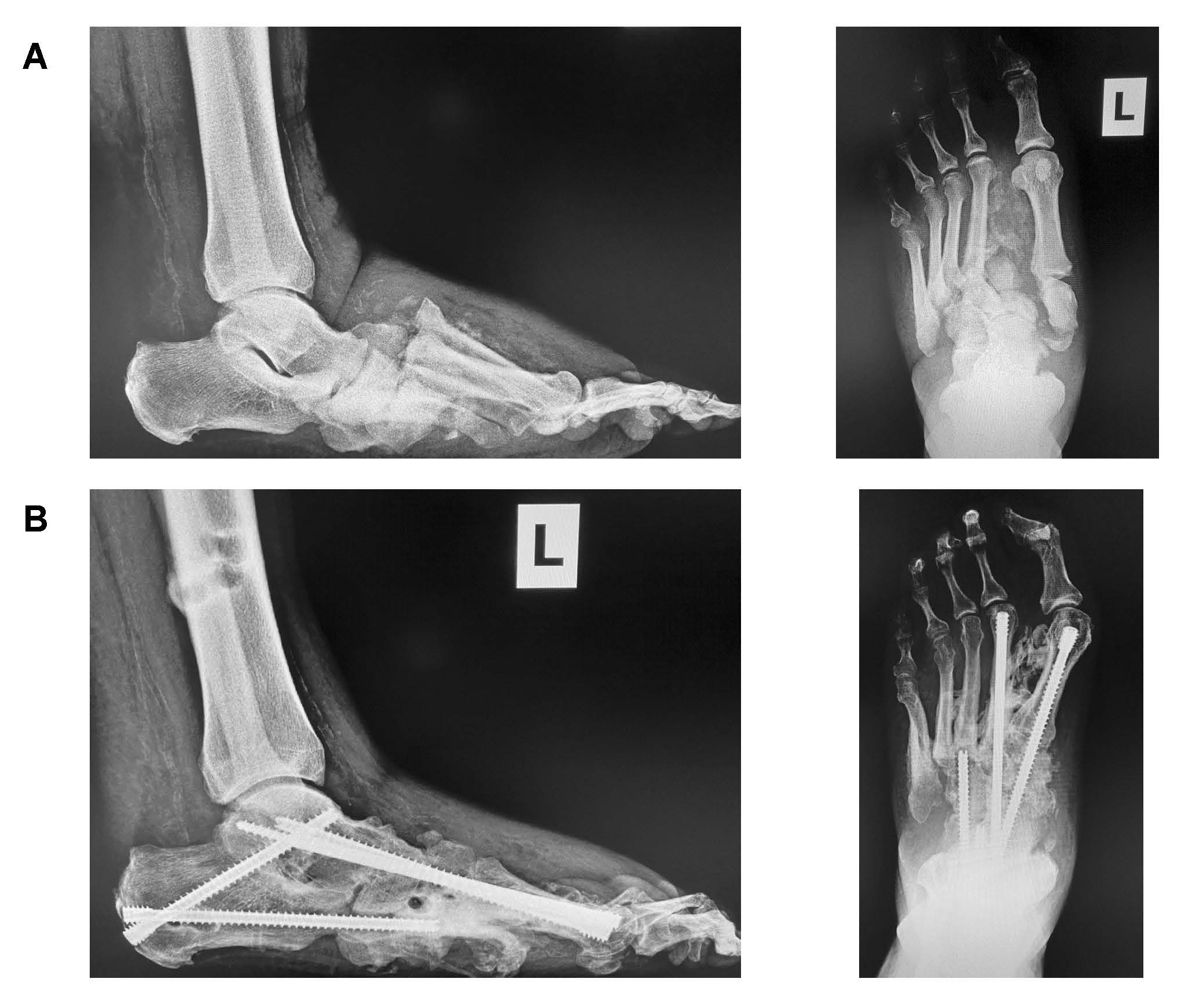 Figure 1: A) Pre-operative vs. B) 1-year post-operative radiographs demonstrating a midfoot Charcot reconstruction with medial and lateral column fusion and sub talar joint fusion with use of beams and bolts.