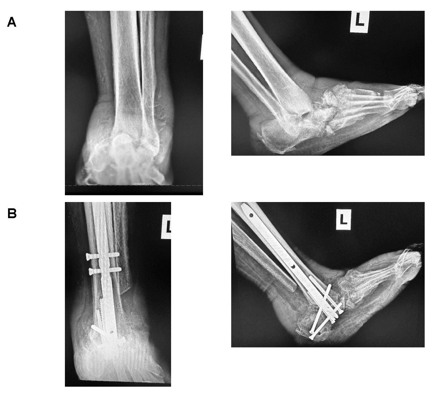 Figure 2: A) Pre-operative vs. B) 1-year post-operative radiographs showing an ankle Charcot reconstruction with ankle fusion using a hindfoot fusion nail.
