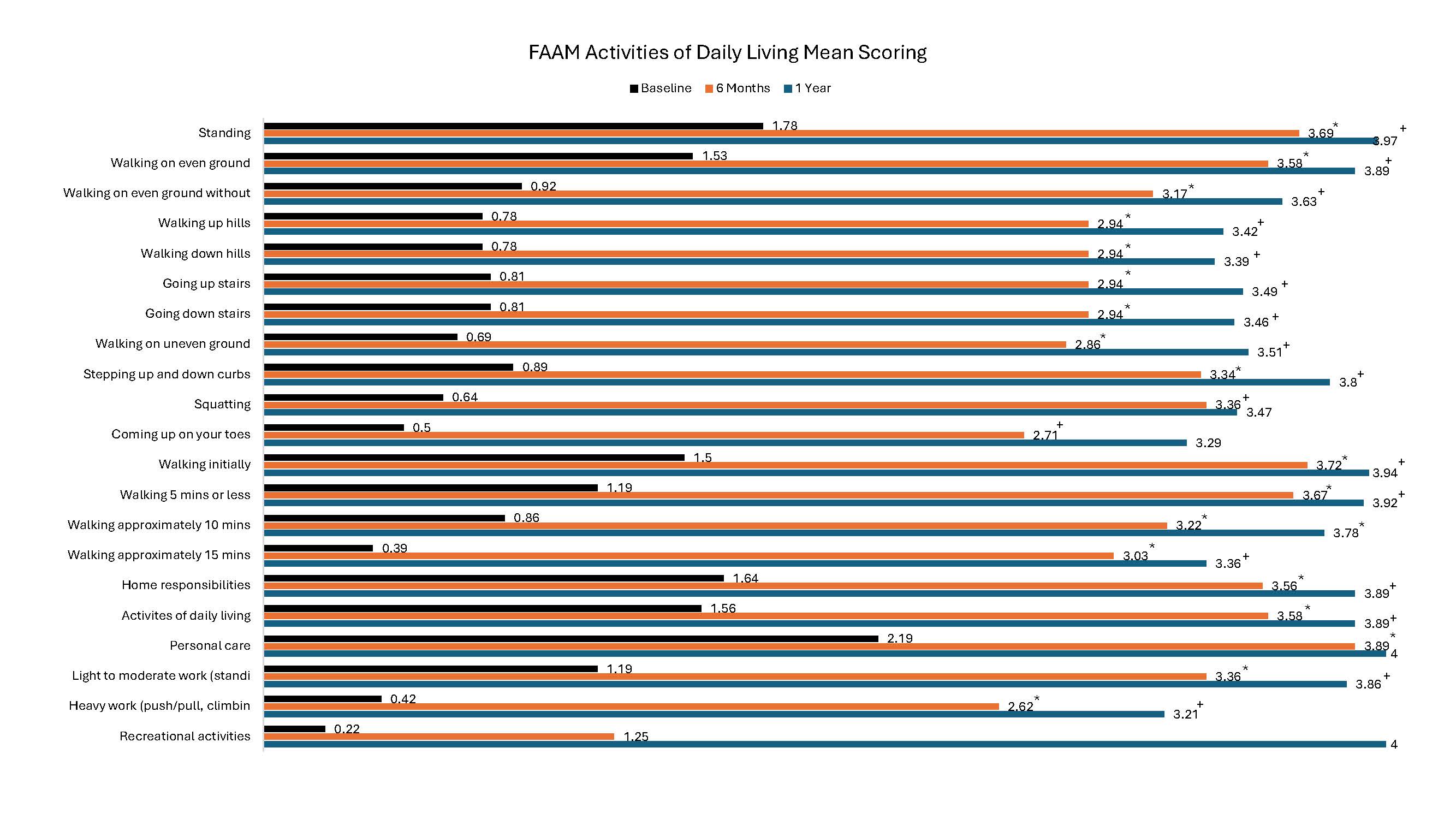 Figure 4: Changes in the mean scoring of each question in the FAAM Activities of Daily Living sub score (n = 36). +p < 0.05; *p < 0.001 vs. previous time point.