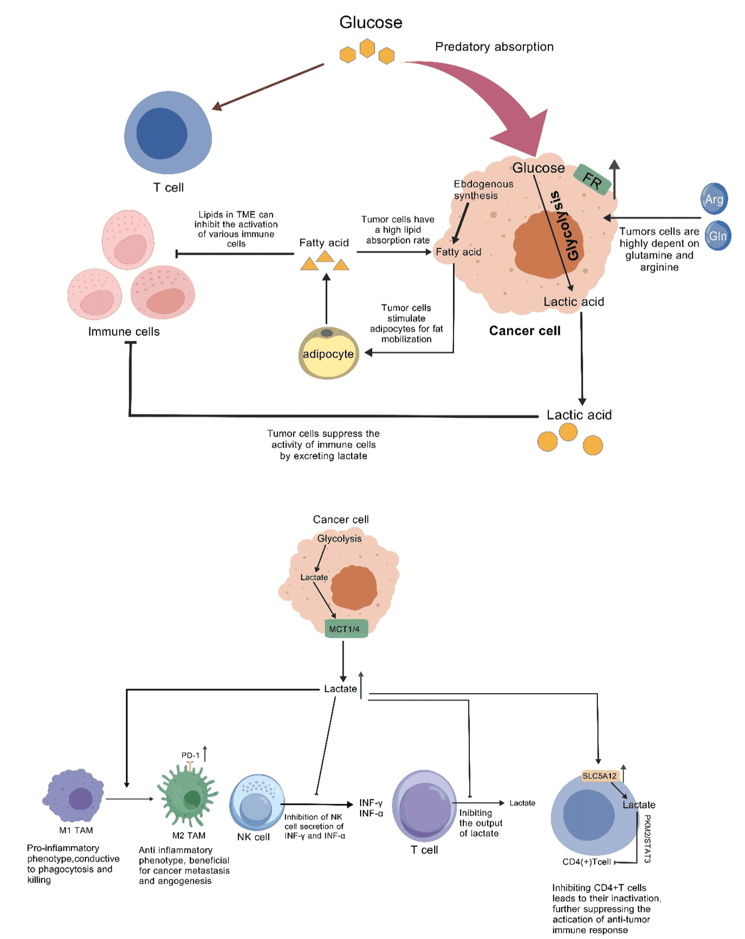Combined with relevant literature reports, we can find that the internal microenvironment of tumor tissues is completely different from the environment of other parts of the body: the chaotic structure and malformed blood vessels in tumor tissues give tumor tissues a strong barrier. Within this barrier, tumor cells frantically plunder nutrients and expel metabolites (tumor cells can even reprogram these metabolites to produce energy again). On the one hand, the effector cells of anti-tumor immunity are deprived of nutrition, on the other hand, they are affected by metabolites, which eventually leads to the state of "more than willing but less capable" of effector cells, so that the anti-tumor immune effector cells are exhausted or apoptotic. What's more, some immune effector cells become accomplices for tumor cells and are used by tumor cells (such as macrophages), promoting the occurrence and development of tumors. The entry of nutrients into tumor cells is one of the fundamental causes of this situation. How to change the destination of nutrients while avoiding the adverse effects of metabolites of nutrients is a major research direction to efficiently kill tumors and improve anti-tumor immune response, which is worthy of in-depth exploration and research.