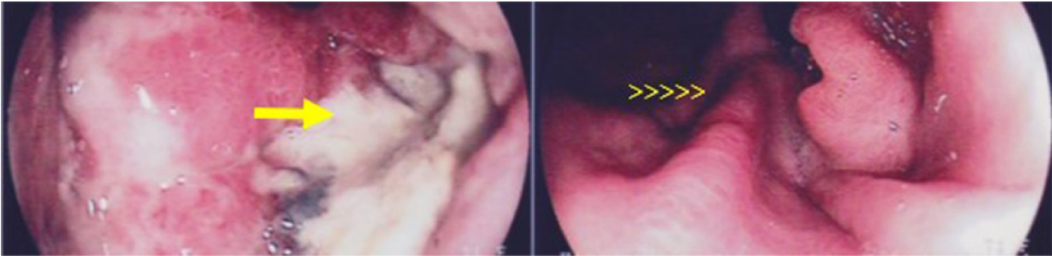 Figure 1: Upper Gastrointestinal Endoscopy showing deep ulceration in the gastric esophagus transition (arrow) and in rear view shows the folds (arrowheads).