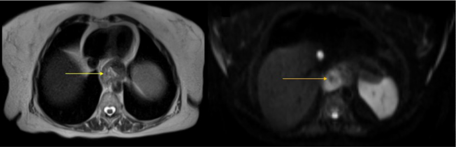 Figure 3: MRI showing an irregular parietal area with discharge at T2 (white arrow) and restriction to diffusion (yellow arrow) at DWI in the herniated gastric esophagus transition.