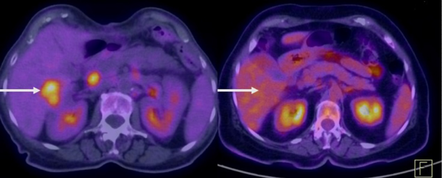 Due to an excellent therapeutic response, the patient was maintained on Pembrolizumab every 3 weeks for another 4 months. A PET-CT in July 2018 not showed the small nodular lesion in liver segment VIII on a comparative analysis with the study from February 2018 and continues ever since (Figure 4).