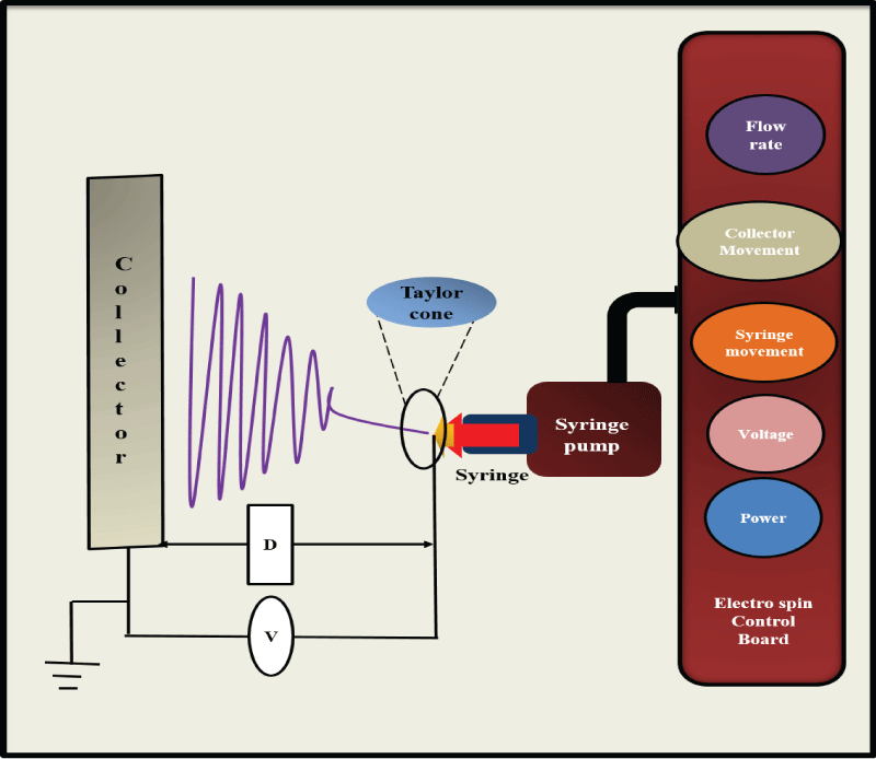 Electrospinning is the most popular technique for the fabrication of nanofibers since 18th century, and utilizes electrostatic forces to form fibers from the spinneret. The basic principle behind electrospinning is on application of high voltage, the particles get charged and forms a cone shaped structure called Taylor cone. This leads to the formation of a jet from the tip of Taylor cone. When applied, potential overcomes the surface tension of the solution which moves along the electric field and get collected to the grounded collector (Figure 1). Under predefined processing conditions and continuous feeding of the polymer solution or melt, a uniform jet can be obtained. This is influenced by various parameters such as viscosity and conductivity of the solution, voltage applied, and distance between the needle tips to the collector and flow rate [7]. The new development in electrospinning includes multi-layered electrospinning, core-shelled electrospinning, two-phase electrospinning, blowing-assisted electrospinning and post alignment methods [8].