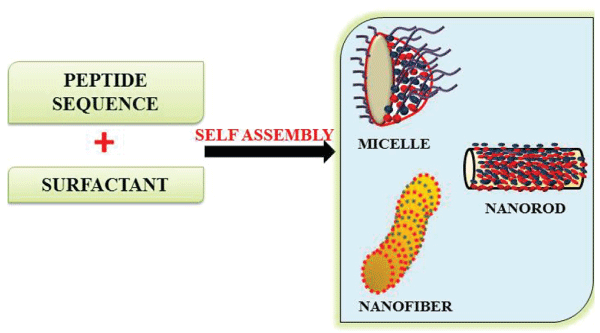 Figure 2: Schematic illustration of self-assembled nanostructures by peptides with surfactants. A peptide sequence in the presence of a detergent such as fatty acids forms different structures like nanofibers, nanorods or micelles by varying the parameters. View Figure 2