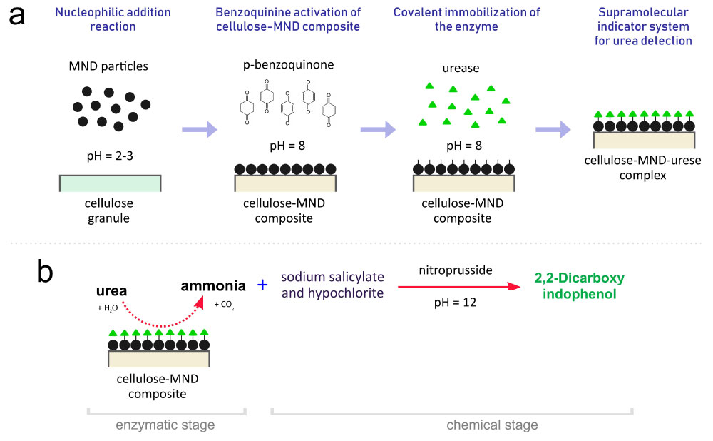 In our previous studies, we showed that MNDs can be used to construct systems for biochemical diagnostics and targeted delivery of drugs and new antibacterial preparations [29-31]. The MND-enzyme systems were used in biochemical assays of physiologically significant analytes [29]. The immobilization of the sensing element (nanoparticle-biomarker conjugate) on a solid support can be adapted and advanced the experimental indicator system for clinical analytical applications. The purpose of this study was to construct and test a biochemical assay system for detecting urea in order to provide an experimental basis for designing a reusable indicator systems based on the cellulose-nanodiamond-biomarker supramolecular complexes.