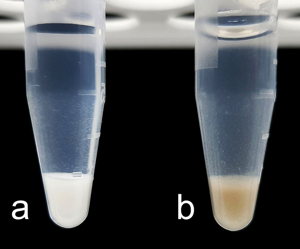 After optimizing the reaction conditions (component ratio, suspension agitation speed, and time and temperature of incubation), we managed to produce a DEAE cellulose-MND composite using the nucleophilic addition method. That was evidenced by a change in the appearance of the polymeric granules after the reaction (Figure 3). The initially milky-white polymer granules turned brown because of the MNDs bound to them during the acidic reaction.