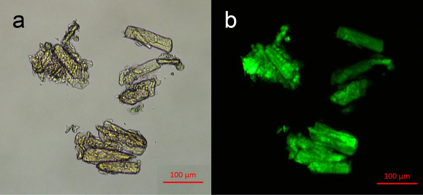 Figure 5: a) The appearance of the DEAE cellulose-MNDs-urease supramolecular system and b) Fluorescence of the FITC-labeled enzyme as a component of the supramolecular system. View Figure 5