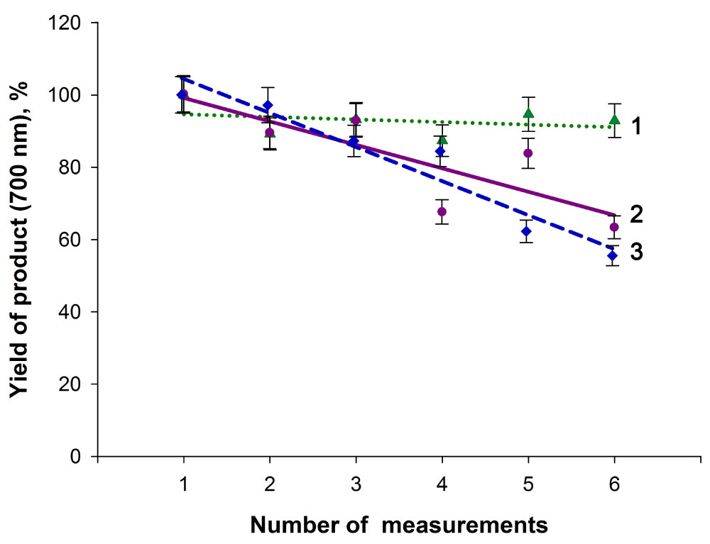 Figure 6: The yield of the reaction product in experiments with the supramolecular indicator systems repeatedly used to detect the analyte at 20-22 ºC. 1- The DEAE cellulose-MNDs- covalently immobilized urease supramolecular system, 2- The DEAE cellulose-covalently immobilized urease system, 3- The DEAE cellulose-adsorbed urease system. The data are normalized to the maximum yields of the product in measurement series. View Figure 6