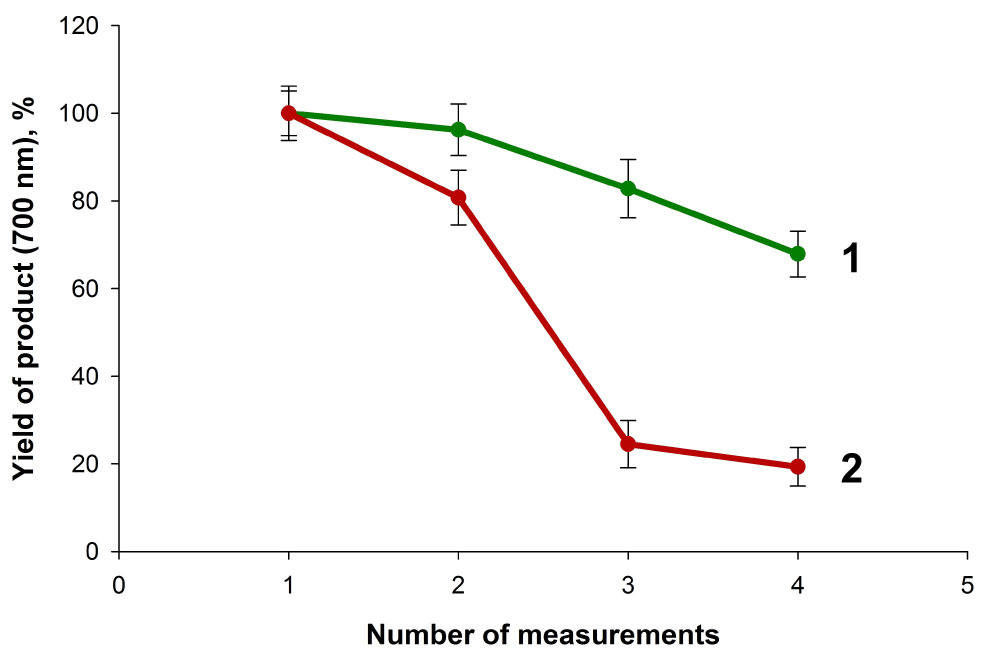 Figure 7: The yield of the reaction product in experiments with the indicator systems prepared by covalent immobilization of the enzyme repeatedly used to detect the analyte at 37 ºC. 1-The DEAE cellulose-MNDs-covalently immobilized urease supramolecular system, 2-The DEAE cellulose-covalently immobilized urease system. The data are normalized to the maximum yields of the product in measurement series. View Figure 7