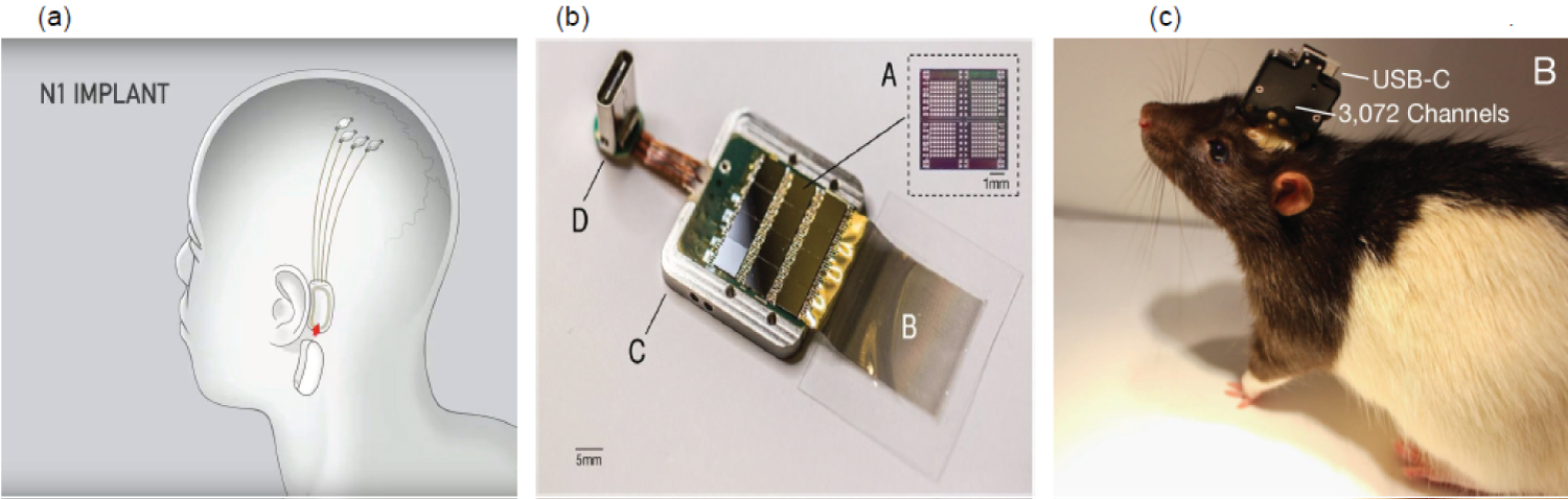 Figure 2: (a) The BCI implanted device in human by Neuralink Company; (b) BCI design with a USB-C interface; (c) Experimental of Neuralink BCI in a rat model (10) [7].