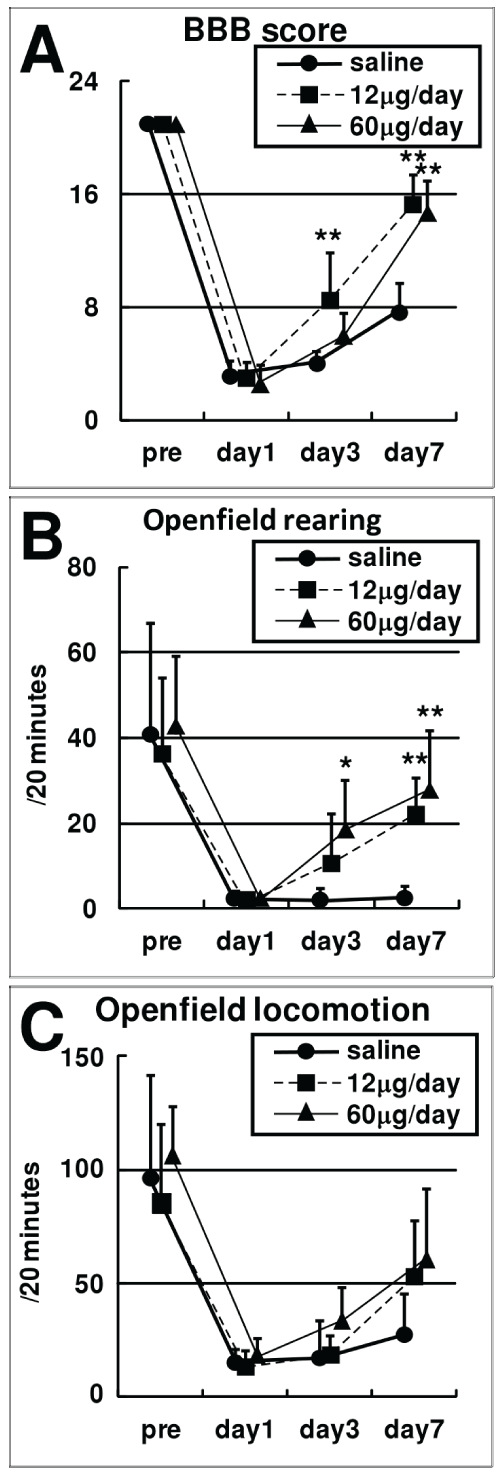 Methods: Adult male Wistar rats aged 12-14 weeks, weighing 250-300g, were used. Spinal cord injury (SCI) was induced by compressing thethoracic cord (Th12) with a 20 g weight for 20 minutes. Thirty minutes later, a total of 60 µl gRb1 solution (12 or 60 µg/60 µl in saline) or the same volume of vehicle (saline) was infused once into the left femoral vein. Subsequently, continuous intravenous administration of gRb1 was performed for 7 days. The locomotor function was assessed using the Basso-Beattie-Bresnahan (BBB) score and the open field test at 1, 3 or 7days after SCI. The animals were killed at 7 days after SCI and the SCI lesions were assessed histologically.