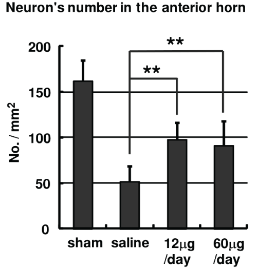 Over the past several decades, researchers have been making desperate efforts, without any great success, searching for intravenously infusible neuroprotective agents for SCI. At present, only methylprednisolone is clinically available. However this agent, even though alleviating SCI, frequently causes serious adverse effects in humans by modulating inflammatory responses in an adverse manner [6]. Finding an intravenously infusible neuroprotective agent that acts safely and favorably on the damaged spinal cord tissue without an increased risk of infection or avascular necrosis of the femoral head appears to be a prerequisite for the treatment of SCI. We speculate that development of an intravenously infusible agent with a potent neuroprotective action would be of great value from the clinical point of view, because such an agent would greatly contribute to elucidation of the molecular mechanisms underlying SCI for which the agent is applied, and would facilitate the development of other innovative treatment protocols and drugs.