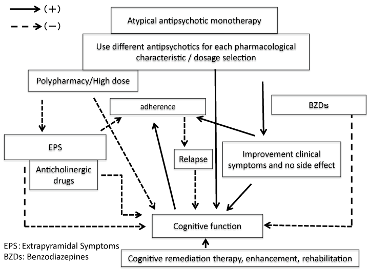 It has been repeatedly noted that schizophrenia patients have poor treatment adherence [28-30]. Poor treatment adherence is the most predictive factor for the relapse of schizophrenia. Disease relapse results in further deteriorations of cognitive function. Therefore, the prevention of relapse is an important pharmacological strategy.