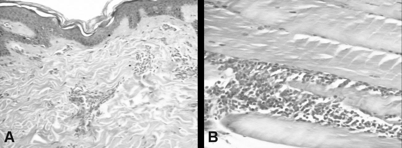 Figure 2: A) Skin biopsy (HE × 100): Mild epidermal lamelar hyperkeratosis. Superficial dermis showing moderate perivascular lymphocytic infliltration; B) Muscle biopsy (HE × 100): Mature adipose tissue, no atypical cells; Skeletal muscle fibers with moderate perimysial lymphocytic infiltrate.