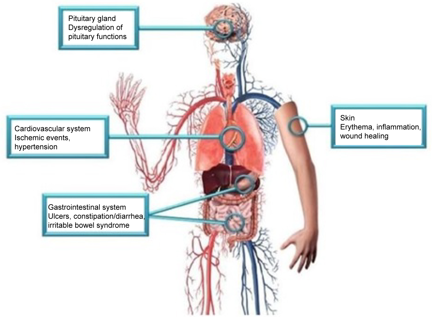 Figure 1: Side effects associated with CGRP blockade may be explained by the action of CGRP in the pituitary gland, cardiovascular system, gastrointestinal system, and skin [4].