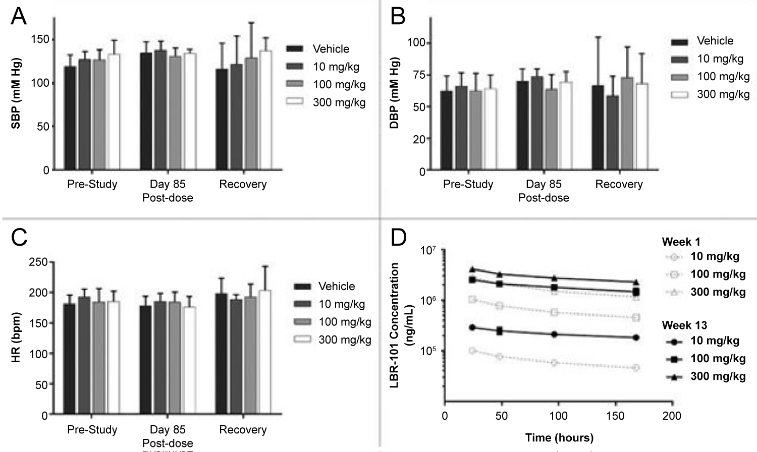 Figure 3: Data was collected prior to the first fremanezumab dose, at day 85 of dosing, and one week after dosing. Data collected during fremanezumab treatment demonstrated no significant difference in systolic blood pressure (A), diastolic blood pressure (B), and heart rate (C). Plasma concentrations were measured to assess accumulation of the drug with repeated dosing [27].
