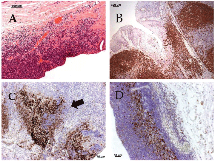 Figure 2: Immunohistochemistry of the lymphomatous tissue of the left eye. (A) H&E staining showing diffuse infiltrate of monomorphic small round blue cells. (B) CD20 positive staining of the majority of lymphoma cells (brown). (C) CD23 staining reveals expanded and disrupted germinal centers. The remnants of germinal centers are intensely stained, while the neoplastic cells are negative (Arrow), classically seen in MALT lymphoma.(D) BCL-6 negative staining for the majority of lymphomatous population, excluding follicular lymphoma.