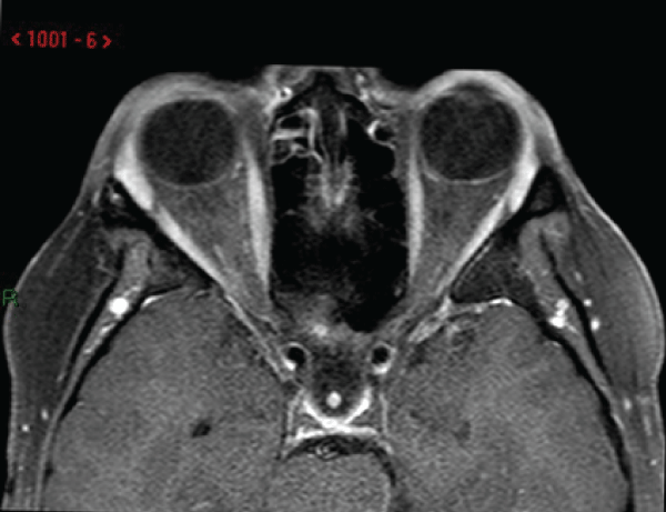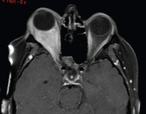 A recent case report demonstrates the novel use of these two agents in the treatment of orbital IRD in a 32 year-old woman who presented with an 18-month history of diplopia, proptosis and headaches (Figure 1A, Supplemental Figure 1A) [44]. An MRI scan showed an ill-defined, intra-conal lesion causing 5mm of proptosis and displacement of the optic nerve supero-medially (Figure 2).