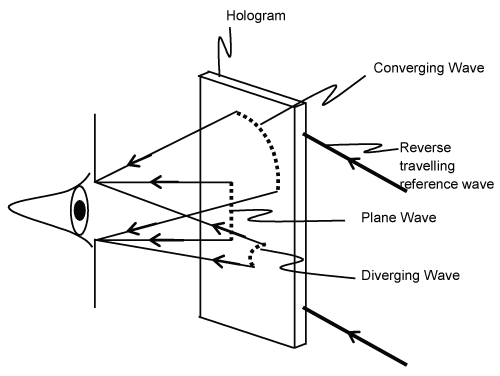 To measure the limiting blur of the subject with the hologram monocularly, the subject is positioned behind the hologram in such a way that his eye is at the same location as the +20 D lens was in the recording geometry. The hologram is illuminated from behind by a plane reference wave that is travelling in the reverse direction to the reference wave that was used while recording the hologram as shown in Figure 2. When the hologram is thus illuminated, the phase conjugate of the recorded waves are recreated in which the image forming rays reversed in direction of propagation emerge from the hologram. The vergence of the rays reaching the eye from the images of the test letters recorded in the hologram would therefore be in the range of +6.5 D to -1.0 D. The plane wave shown in the sketch represents the light coming from the image of the character V formed at infinity. The diverging wave corresponds to the light coming from the real image of a test letter in front of the subject’s eye and the converging wave corresponds to the light that is travelling towards the virtual image of a test letter. The test letters corresponding to the converging waves at the eye would appear blurred to the subject. The subject is asked to call out the letters that he can recognize. The vergence corresponding to the letter with the most positive blur that is recognized by the subject, gives a measure of the limiting blur for the subject.