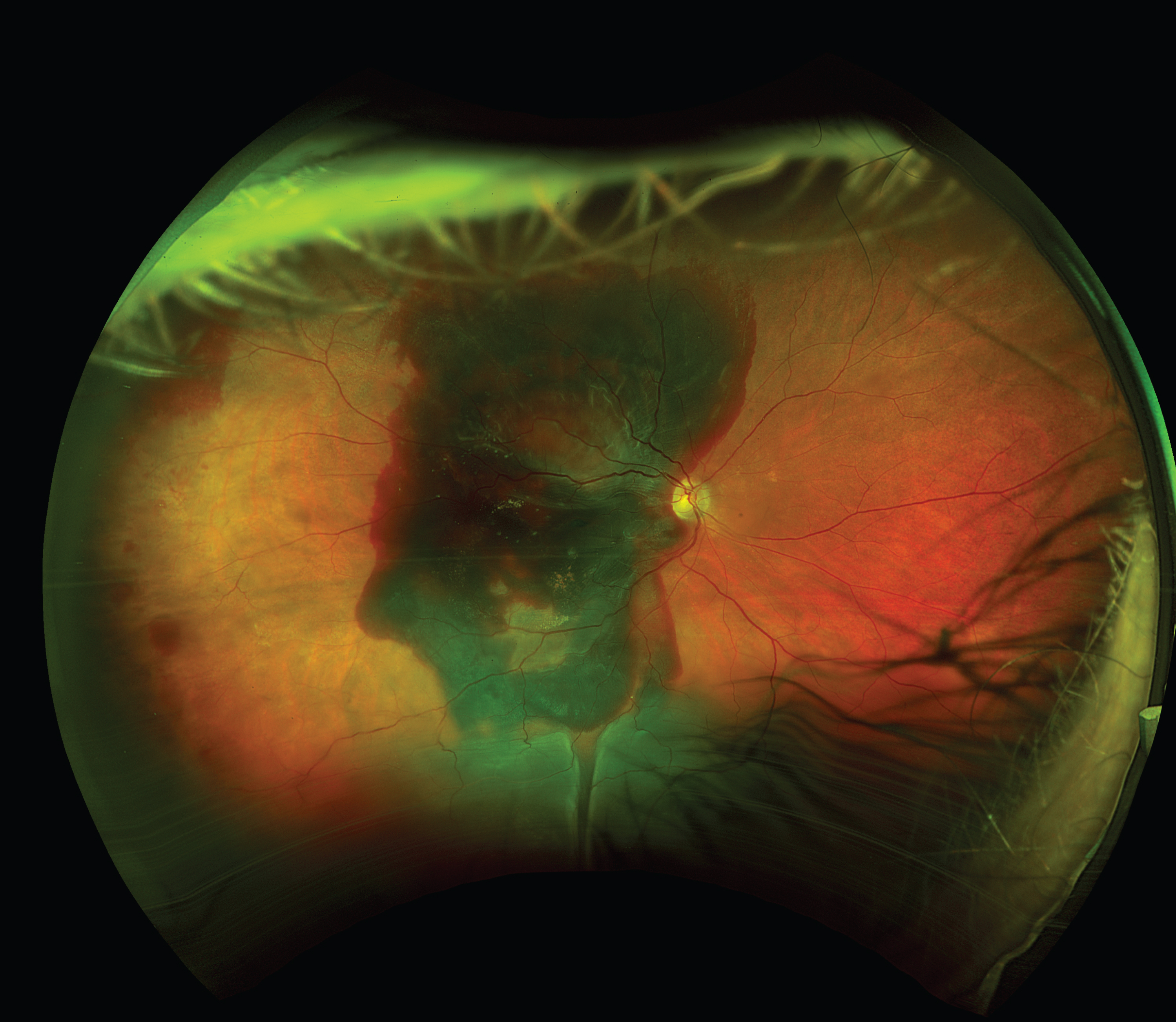 This is a widefield colour fundus photograph of the right eye of an 83-year-old patient with wet AMD. The image shows extensive subretinal haemorrhage involving the macula and extending superiorly and inferiorly with serous retinal detachment inferiorly as a complication of wet AMD. Best corrected visual acuity dropped from 6/9 to HM. The patient underwent Intravitreal injection of Tissue plasminogen activator (tPA), ranibizumab and C3F8 gas to displace the blood from the macula (Figure 1).