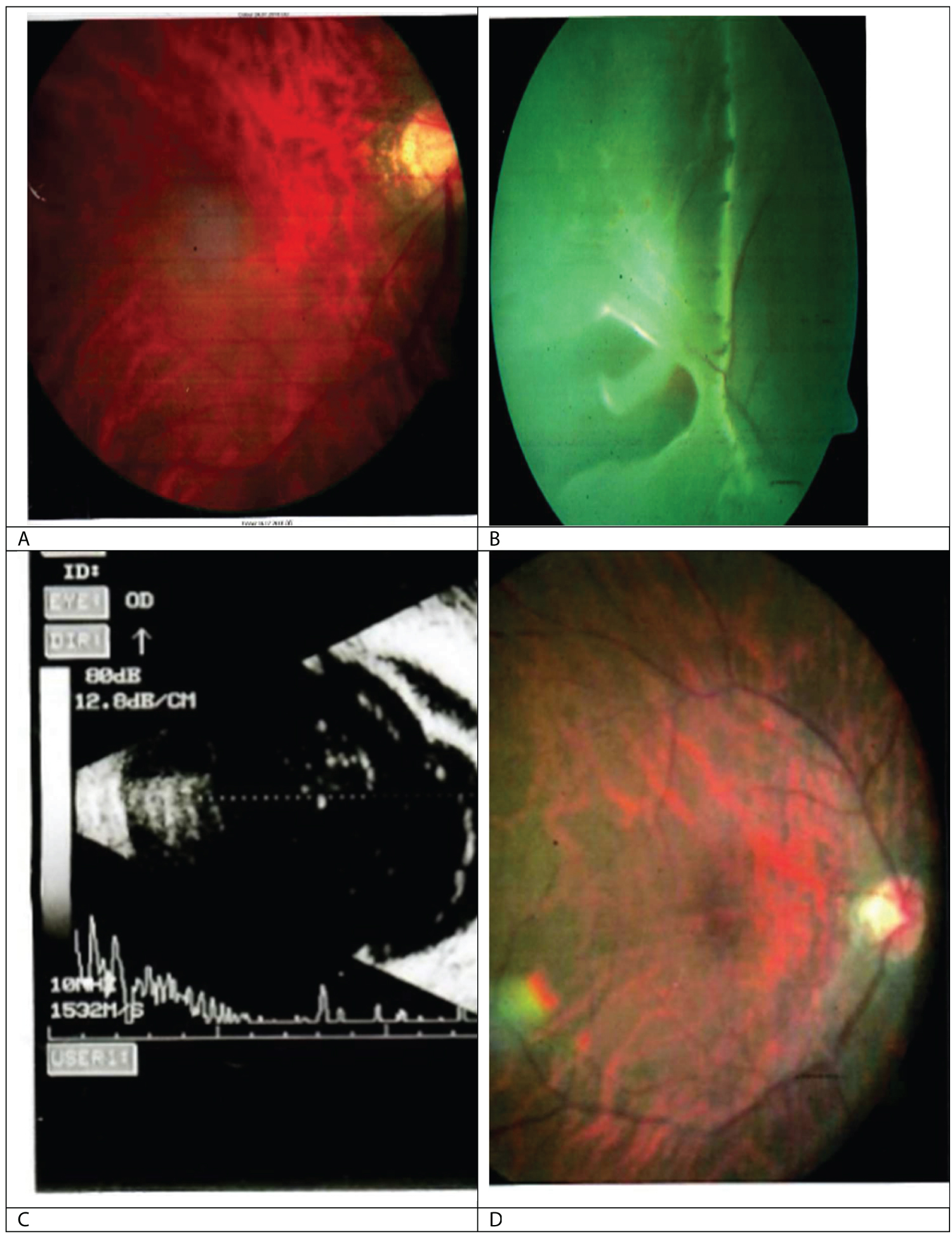 Figure 1: Features of macula on rhegmatogenous retinal detachment in the right eye of a 54-year-old high myope. (A) Shows macula on with presenting best-corrected visual acuities of 6/9; (B) Shows one of two peripheral retina tears at 9 o'clock with temporal retina detachment (second tear at 11 o'clock was not visible on fundus photograph); (C) Ultrasound B scan features of retinal detachment with associated posterior vitreous detachment; (D) Posterior pole of reattached retina after removal of silicon oil with vision maintained at 6/9 best corrected.
