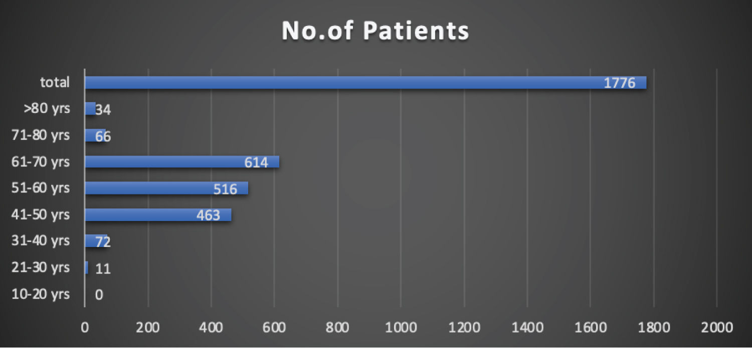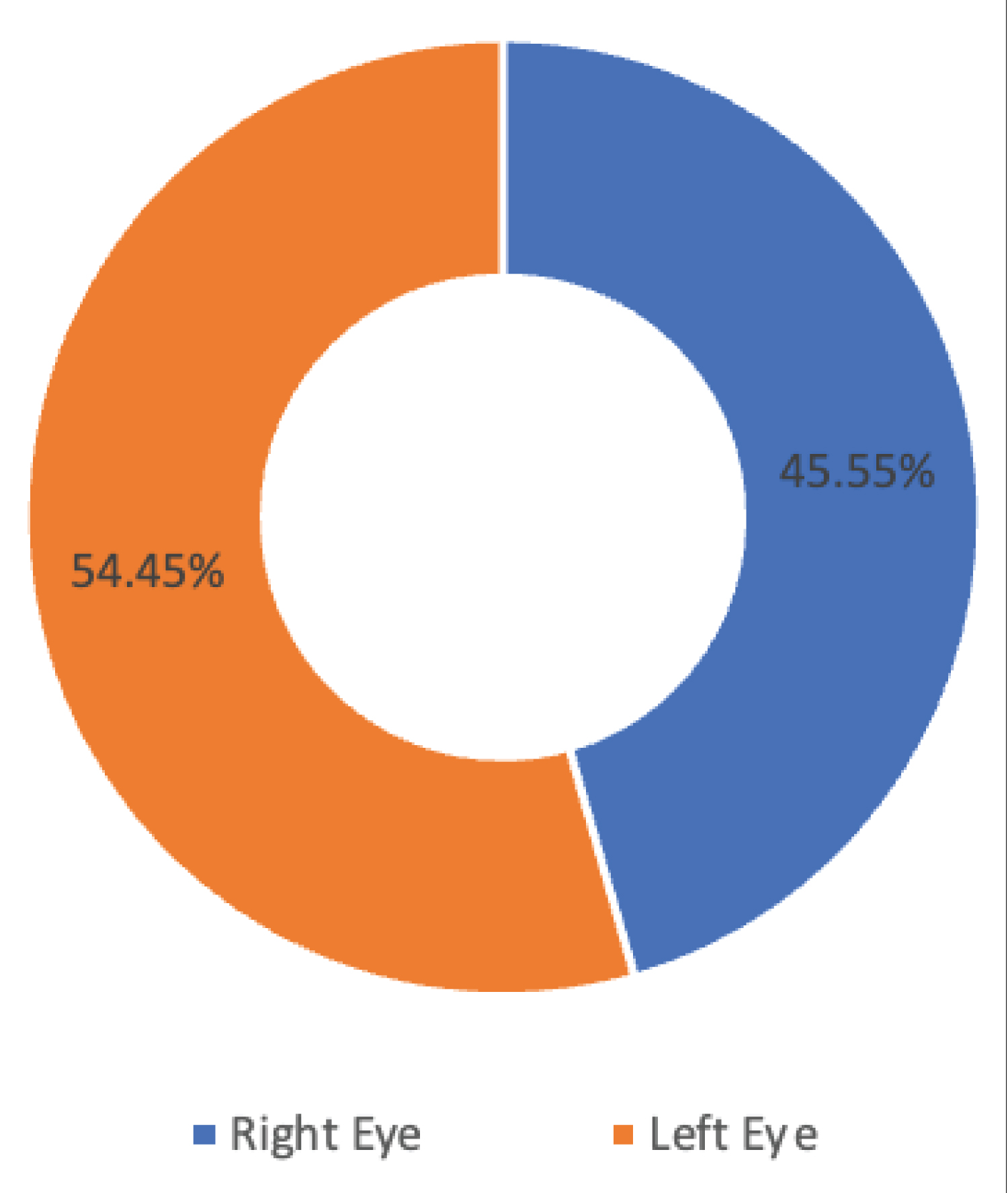 The chi-square test was performed using excel sheet and the result was highly statistically significant with p-value of 0.0005. Out of 1776 operated cases, 809 (45.55%) patients were operated in their right eye and 967 (54.45%) patients were operated in their left eye, showing difference in distribution of surgical cases by laterality (Figure 2).