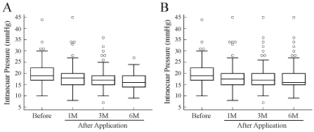 A) Data of 81 out of 116 enrolled patients, who completed the follow-up until 6 months (M) after the initiation of ripasudil instillation; B) Data of all 116 patients, which were adjusted by the last observation carried forward method. Open circles indicate outside values defined as values that are smaller than the lower quartile minus 1.5 times the interquartile range, or larger than the upper quartile plus 1.5 times the interquartile range. View Figure 1