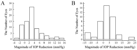 Figure 3 shows histograms of the number of patients either with POAG (Figure 3A) or secondary and developmental glaucoma (Figure 3B) stratified by the magnitude of IOP reduction at 6 months relative to pre-medication IOP when the LOCF method was applied. The patients with POAG exhibited a skewed distribution toward the right, whereas those with secondary and developmental glaucoma showed a normal distribution, with the former having a narrower range than the latter.