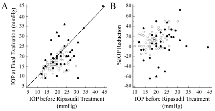 Figure 4: Scatter plots of intraocular pressure (IOP) at final evaluation (A) and IOP reduction rate (B) against IOP before ripasudil treatment.