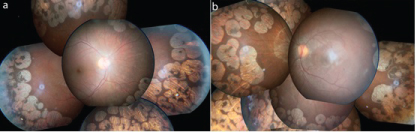 An 11-year-old Syrian refugee boy complained of long-term blurred vision in his both eyes for a few years. He was misdiagnosed as Retinitis Pigmentosa in his country. At presentation, best-corrected visual acuity (BCVA) was 20/40 in his right eye (RE), and 20/32 in his left eye (LE). The refractive error was -5,75 diopter (D) in the RE and -5.25 D in the LE. Both eyes intraocular pressure was found within normal limits. On his fundus examination detected severe, well-demarcated multiple widespread chorioretinal atrophy involving the mid-periphery bilateral (Figure 1). Cystoid macular edema was evident in his both eyes on SD-OCT. Elevated levels of plasma ornithine at 889 μmol/L (Reference range: 10-163) and urine ornithine at 4206.22 μmol/g Kre (Reference range: 31-91) were also detected. The clinical diagnosis was consistent with GA of the choroid and retina. The patient treated with vitamin B6 (pyridoxine) 300 mg daily and an arginine-restricted diet.