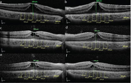 The macular thickness (MT) and ChT was measured by the SD-OCT (Heidelberg Engineering, Heidelberg, Germany) and it repeated in each monthly visit of the patient. Choroidal thickness was measured perpendicularly from the outer edge of the retinal pigment epithelium to the choroid-sclera boundary at the fovea. Central and at six more points which are located at, respectively, 500 μ nasal to the fovea, 1000 μ nasal to the fovea, 1500 μ to the fovea, 500 μ temporal to the fovea, 1000 μ temporal to the fovea and 1500 μ temporal to the fovea were noted. The average of these 7 measurements was taken. Choroidal thickness measurements were made by two masked ophthalmologists (FMA and HO). The average of these two measurements was taken.