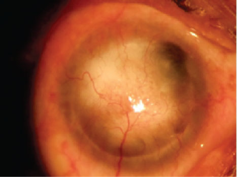 A 65-year-old male complained of pain, redness, watering and diminution of vision of left eye for one month following trauma with paddy leaf. He had been receiving treatment from another private centre for the last one month in the line of bacterial corneal ulcer but the symptoms still persisted. When he visited us, he had visual acuity of perception of light (PL) positive with inaccurate light projection in right eye (RE) and Hand motion (HM) vision in left eye (LE). The right eye had a small nebular scar measuring 2 × 3 mm in the inferior peripheral cornea extending from 4 to 6 o'clock position. There was presence of sluggish pupillary reaction with relative afferent papillary defect (RAPD) in right eye due to glaucomatous optic atrophy (GOA) in right eye.