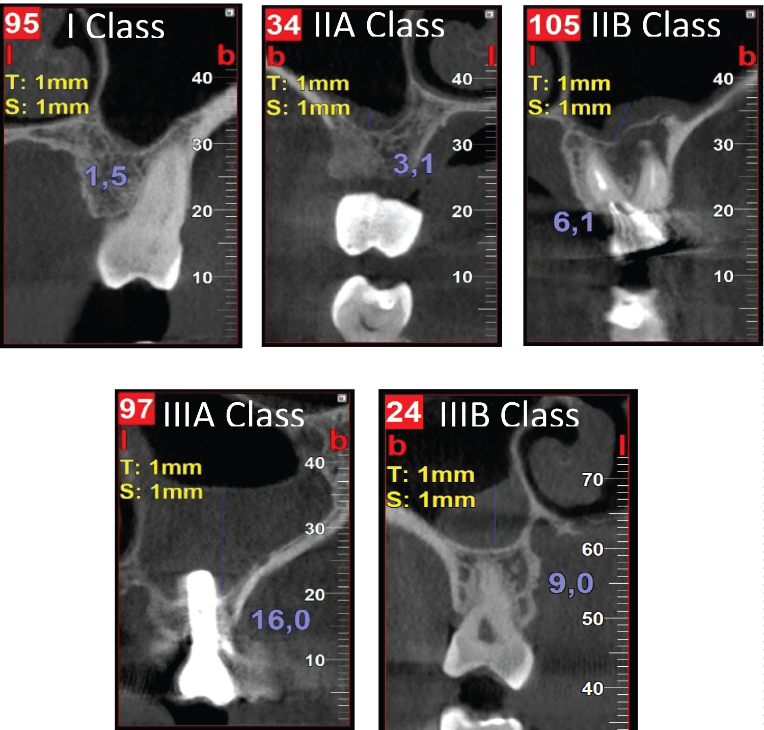 Figure 1: CBCT sections of maxillary sinus examples according to DiGirolamo classification.