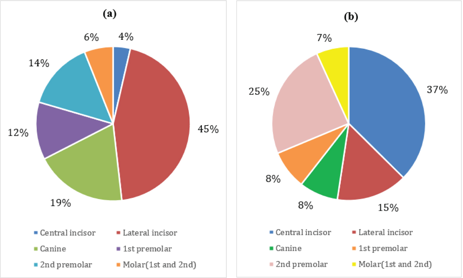 Figure 2: a) Distribution of missing teeth in the maxilla; b) Distribution of missing teeth in the mandible.