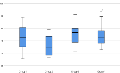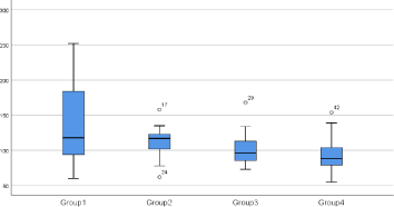 The mean number of internal gaps was highest in Group 1 - Retrograde (Putty Only) (M = 138.00, SD = 57.59) and lowest in Group 4 - Orthograde (Deep Putty + Sealer) (M = 96.77, SD = 30.90). The median values followed a similar trend. Descriptive statistics are presented in table 1 . Rank-based analysis (Table 1) showed that Group 1 had the highest mean rank (32.35), while Group 4 had the lowest (19.85). The Kruskal-Wallis H test (Table 1) revealed no significant difference among groups regarding the number of internal gaps (H = 5.720, df = 3, p = 0.126) (Figure 9).