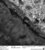 Figure 12: Adaptation in Group 4. High-resolution SEM (× 2500) of a sample from Group 4 (deep orthograde putty packing) showing adaptation along the dentin interface. Scale bar: 10 µm.