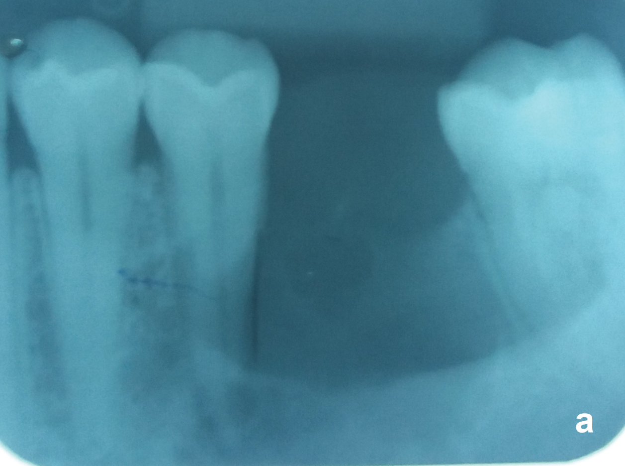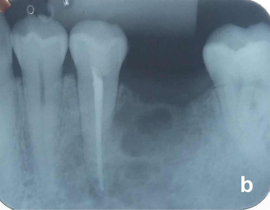 Nonvital teeth close to the OKC may be endodontically treated and maintained (Figure 5a and Figure 5b) but those with the cyst adhered on the radicular surface or with radicular resorption by the OKC should be removed. After total removal of the OKC, patients should receive a yearly radiological follow-up the first five years and beyond that every two years. Recurrences may occur over as long a period of 25 years [18].