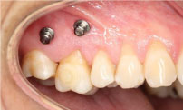 In six months tooth 1.6 was correctly positioned on the occlusal plane and the lower implant was in optimal condition to be rehabilitated. The crown was set on tooth 4.6 and the upper metallic retention and the micro screws were removed.