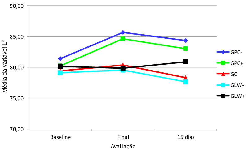 Figure 1 illustrates the speed of bleaching through the behavior of the variable L* during the study. It was observed that the "L*" averages increased from the baseline to the final evaluation (the averages were positive in the PC-, PC+, GC and LW-) and reduced (the average was negative) in the LW+; the average values of the "L*"decreased from the final evaluation to 15 days after treatment in the PC-, PC+, GC and LW- (the averages were negative) and increased in the LW+ (positive average). The difference between the groups was recorded in the L* (final-baseline) variation, being significant among: PC- (average 4.28) and PC+ (average 4.42) compared to GC (average of 0.97) , LW- (average equal to 0.43) and LW+ (average equal to-0.30).