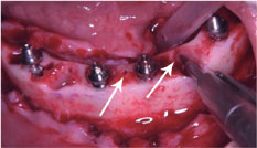 Figure 4: Perforation performed in the lingual/buccal face of alveolar bone, between implants previously placed, using a straight handpiece with a 1.1 mm diameter.