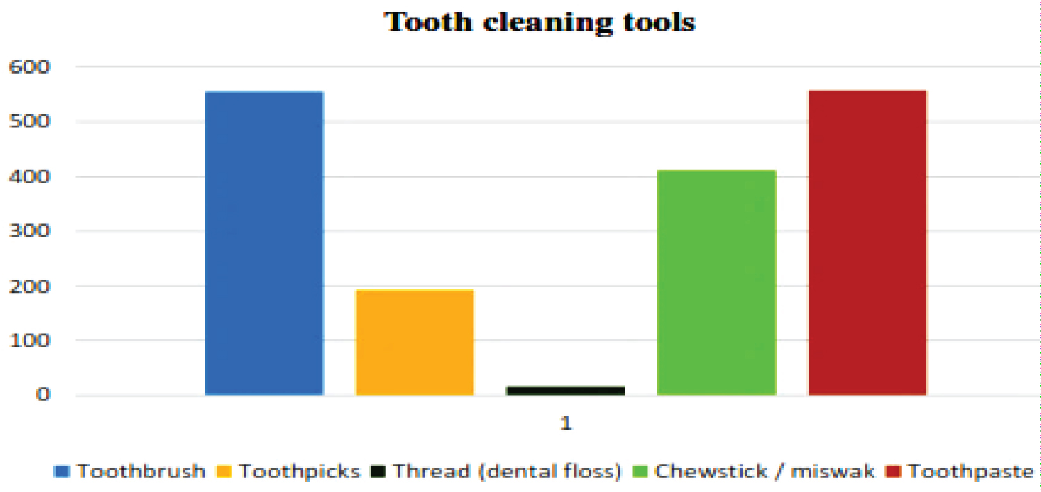 Tooth frequency and cleaning tools used by the participants: Regarding the frequency of tooth cleaning, only 201 (35.2%) of the students washed their teeth two times or more a day, whereas less than one-fourth (22.4%) cleaned once a day (Figure 2). The most frequently used cleaning tools were a toothbrush and local Chew-stick utilized by 97% & 70% of participants, respectively (Figure 3). Only a few 2.8%, used dental floss for a dental cleaning once a day. The majority of the participants (97.4%) used toothpaste during tooth cleaning (Figure 3), but (89%) of them were unaware of the presence of fluoride in their toothpaste (Table 3). Out of the students who used toothpaste, only 164 (29.4%) applied toothpaste to a total length of the bristles. Regarding the frequency of changing toothbrushes, around one-third of the children, 197 (34.4), changed their brush every three months, while 202 (35.3) of them changed their toothbrushes when bristles got frayed up (Table 3).