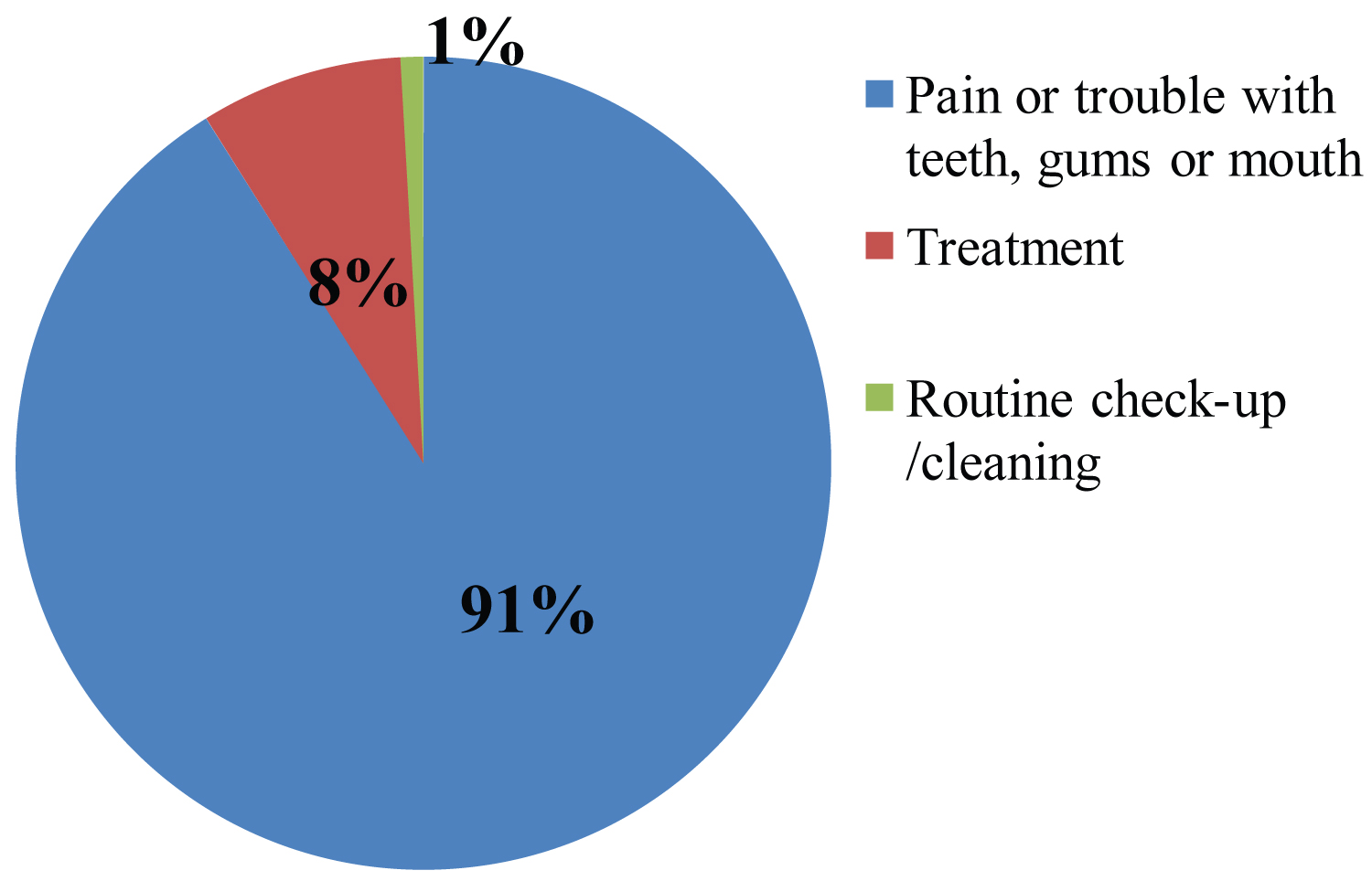 Reason for a dental visit among participants: The reason for a dentist visit was due to pain or a problem with a tooth cited by a few of the total participants (17.8%) for treatment or follow-up 8%, and only one percent was for routine check-up of tooth or cleaning (Figure 7).