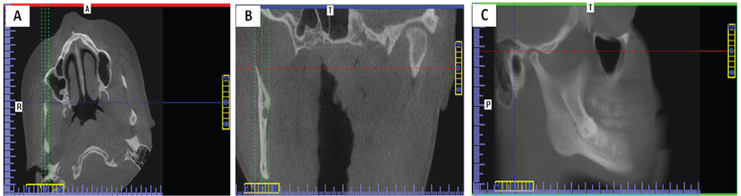 Figure 1: A) Standardization of axial view on I-CAT Vision software that showed the beginning of complete separation between mandibular condyle and coronoid processes. The axial view was rotated till the condyle and coronoid became on the same plane, and the sagittal plane was moved to pass through both the condyle and the coronoid; B) Standardization of coronal view on I-CAT Vision software that showed the start of complete visualization of the mandibular foramen. The coronal view was rotated till the buccal wall of MF was parallel to the sagittal plane. The sagittal plane was then adjusted to pass through the buccal wall of the mandibular foramen; C) Corrected Sagittal view on I-CAT Vision software was obtained from which accurate measurements can be obtained.