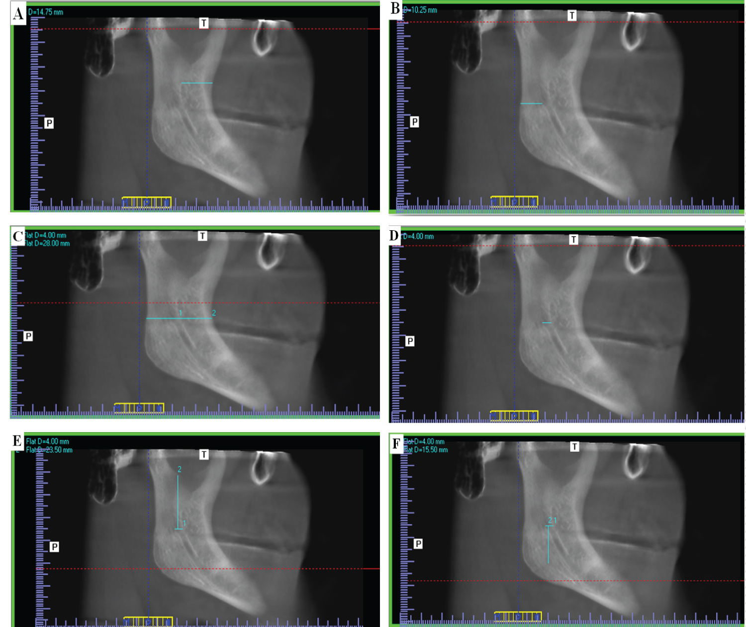 Measurements of AB-MF, PB-MF, RW, CW, MN-MF and MF-IB on the standardized sagittal view are illustrated in (Figure 2A, Figure 2B, Figure 2C, Figure 2D, Figure 2E and Figure 2F) sequentially. The ramus mandibular height (RH) was calculated by adding distances MN-MF and MF-IB from (Figure 2E and Figure 2F).