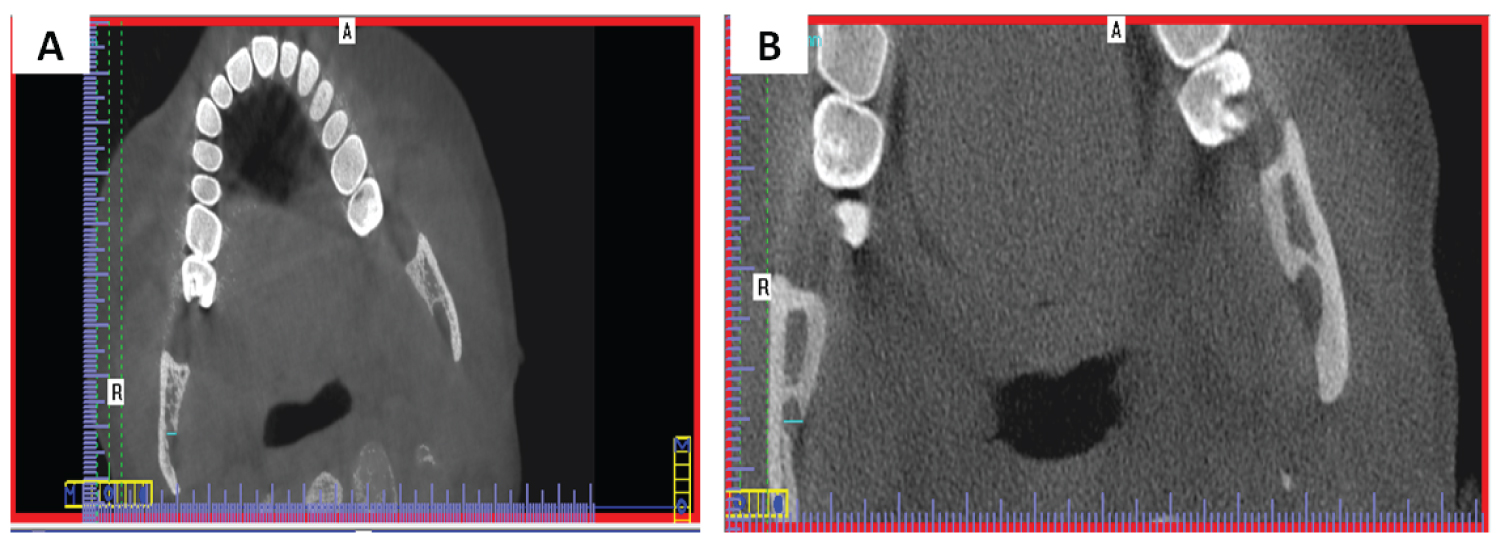 Figure 3: A) Standardization of axial view on I-CAT Vision software to measure MFD. The axial slice just before the mandibular foramen was completely surrounded by a bony cortex was rotated till the buccal wall of the MF became parallel to the sagittal view; B) Measurement of Depth of the mandibular foramen MFD in a forty-three-year-old dentate female on I-CAT vision software.