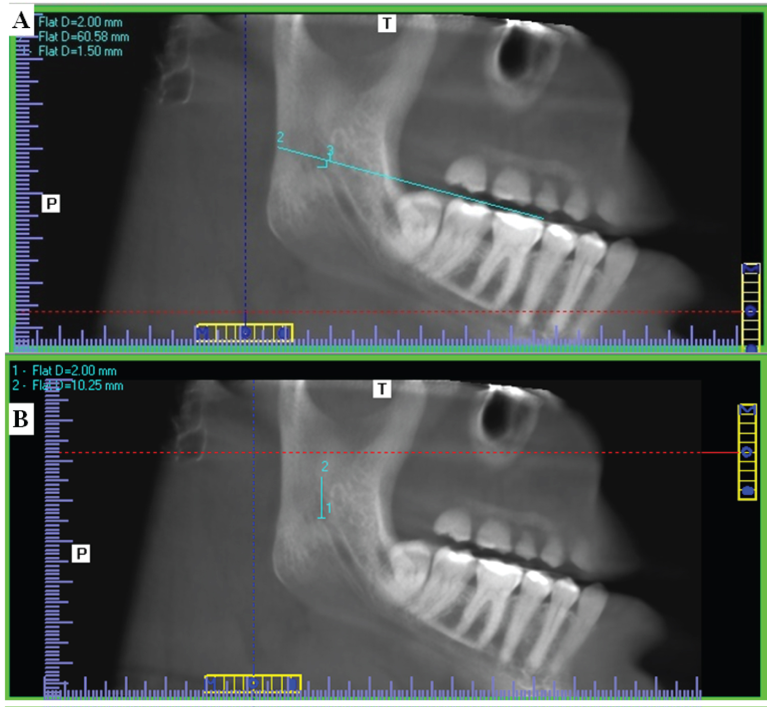Figure 5: Corrected sagittal view on I-CAT vision software in forty-three years dentate female showing measurements; A) Distance from entering point of mandibular foramen to occlusal plane of mandibular right first and second molars. MF-OP; B) Distance from entering point of mandibular foramen to the apex of the retromolar trigone MF-ARMT.