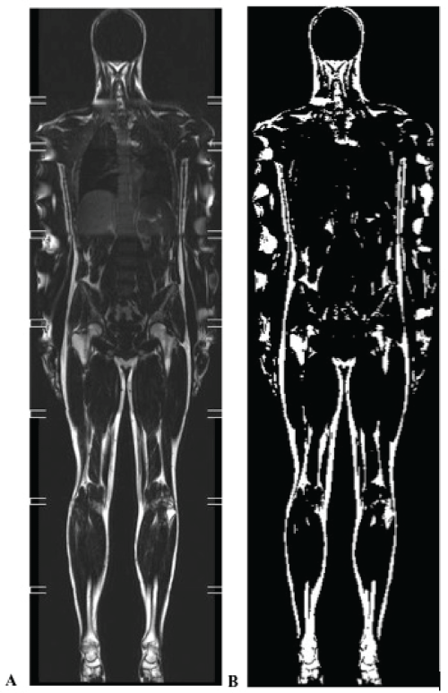 This study was cross sectional in nature. Body height was measured to the nearest 0.2cm using a stadiometer (Seca Mod 220, Hamburg, Germany). Body weight (measured to the nearest 0.05kg) and fat mass were estimated using the Multi-Frequency Body Composition Analyser MC-180MA. Fat mass was also estimated using whole body MRI (3T Philis Achieva MRI Scanner, Philips Amsterdam, and The Netherlands). Participants were scanned in the supine position using an eight station whole body imaging protocol to achieve full body coverage. The sequence used was a T1-weighted, TFE sequence with water suppression (echo time=2.3 ms, repetition time=774 MS, WFS=1 pixel, flip angle 70 degrees, spectral presaturation inversion recovery (SPIR) water suppression, NSA=2, integrated body coil). This weighting ensures that body fat is shown as hyperintense in relation to other structures in the image. The resolution of multi-slice 2D images in the coronal place was 1.83mm by 2.48mm with a slice gap of 1mm. Coronal images were reconstructed on a 1.345mm by 1 .345mm interpolated matrix. Multiple breath- holding was used to reduce motion artefact while scanning the station over the lungs and upper abdomen. Each scan generated 30 whole body coronal images. Each coronal image consisted of eight images from each of the scanned stations fused together to form a single image. Fusing was achieved using the MRI's own image fusing software (MobiView™). Images were exported to a bespoke application written in MATLAB (Mathworks, Cambridge, UK) for fat quantification. Images were thresholded using a technique called Otsu's method [22]. At each station level image in a coronal slice, a threshold pixel grey level value was chosen above which a pixel is considered to represent a fat voxel. In Otsu's method the threshold is automatically chosen by minimising the grey level variance within the above and below threshold pixel populations. The resulting operator view is a stack of 30 coronal whole body 'binary' images with 'fat' showing white and all else black (Figure 1). These binary images could be further manually edited by the operator to cut out remaining bright pixels associated with bone marrow. The total fat volume with a region of interest was calculated by a simple count of the total number of voxels above threshold in that region.