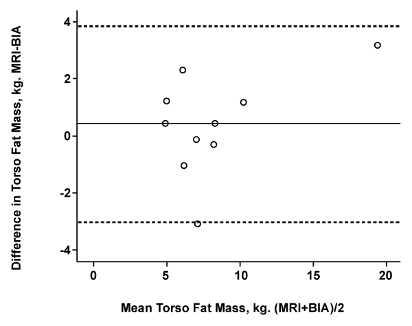 Figure 2: Bland and Altman plot of agreement between MRI and BIA for torso fat mass